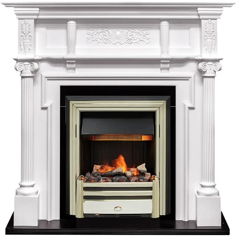 Утонченный портал Oxford с богатым декором: боковые колонны в античном стиле, изысканный резной орнамент, геометричные линии, контрастное по цвету основание, которое немного выступает вперед, оттеняя реалистичное пламя в очаге.