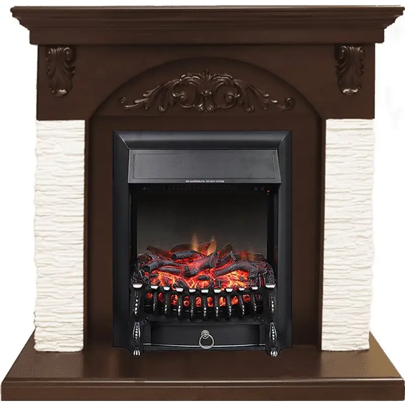 Столешница и постамент портала выполнены из дерева, а боковые колонны – из искусственного камня. Зона очага выделена углубленной деревянной аркой с декором.