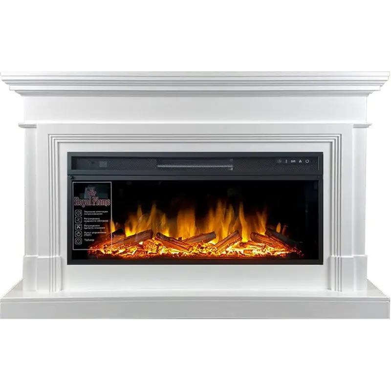 Портал Coventry подходит под электрические камины Royal Flame. В очагах встроена технология имитации реалистичного пламени и звуков потрескивающих дров, а также функция обогрева и регулировки яркости пламени.