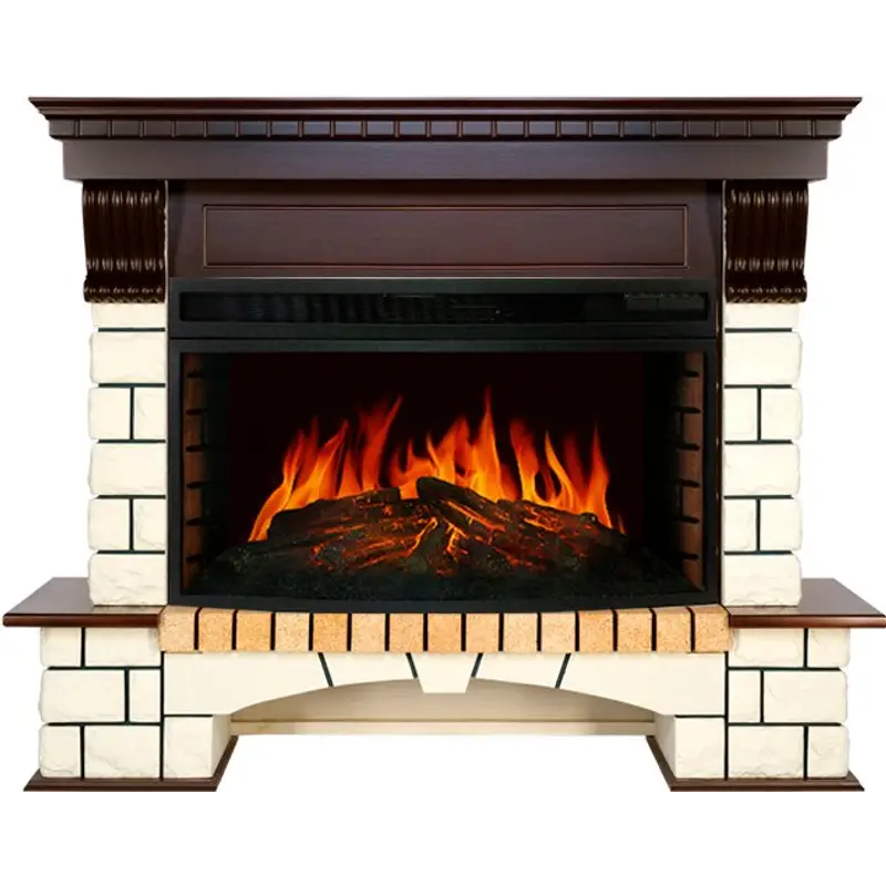В качестве декоративного топлива в очаге используются реалистичные поленья со светодиодной подсветкой, которая в совокупности со звуковой имитацией потрескивания дров усиливает эффект натуралистичности пламени в топке.