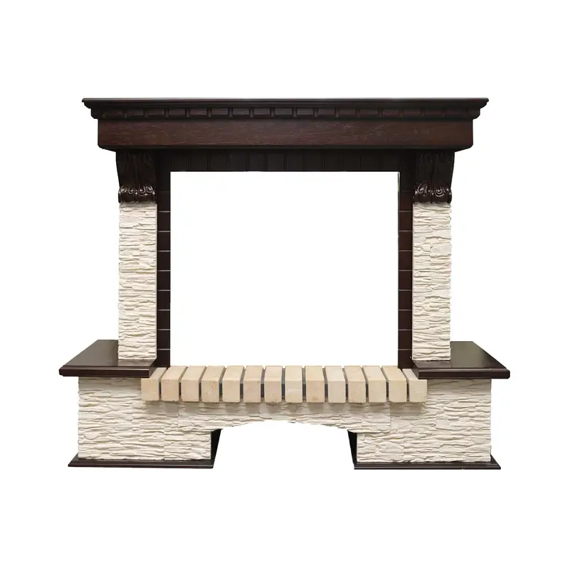 Модель представлена в нескольких вариантах, различающихся как по принципу установки (угловой или пристенный), так и цветовым решением облицовочного камня и деревянных элементов. Декорирована резными вставками в античном стиле.