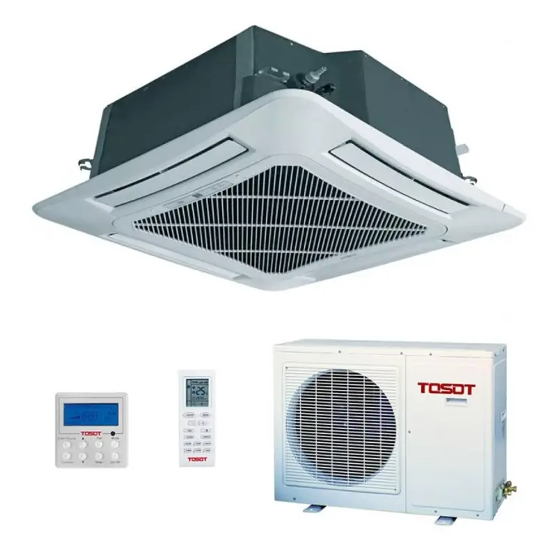 Кассетные сплит-системы Tosot отличаются упрощенным монтажом и используются для обслуживания помещений с большой площадью. Все модели оснащены системой подготовки воздуха, поэтому при включении режима обогрева, в комнату не попадают холодные потоки. Приборы автоматически перезапускаются после внеплановых отключений электричества.
