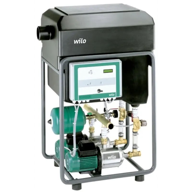 Автоматическая установка для подачи дождевой воды и подпитки природной водой в виде компактного модуля для многоквартирных домов и общественных зданий, которая состоит из: двух самовсасывающих многоступенчатых горизонтальных высоконапорных центробежных насосов с низким уровнем шума и гидравлическим всасывающим трактом нового типа. Шаровой затвор со всасывающей и напорной стороны на каждом насосе со сборной системой трубопроводов с напорной стороны. Бак подпитки (150 л) с подпиткой пресной водой по необходимости при незаполненной цистерне. Проточный мембранный напорный резервуар (8 л) в соответствии с DIN 4807 обеспечивает экономию электроэнергии при микроутечках в здании. Все детали, находящиеся в контакте с перекачиваемой жидкостью, выполнены в антикоррозионном исполнении.