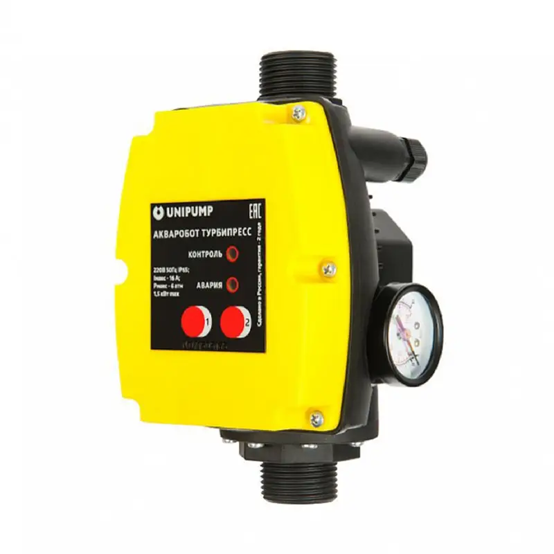 Блок управления модели Unipump ТУРБИПРЕСС используется для автоматического включения и отключения насоса. Данное устройство предусматривает работу совместно с насосами погружного или поверхностного типа. Прибор абсолютно безопасен в использовании и имеет высокую степень защиты – IP 65. Блок имеет заводскую установку давления включения 1±0,3 бар и выключения 3±0,3 бар, однако пользователь может настроить эти значения по своему усмотрению в диапазоне 0,5–4,5 бар (на включение) и 2,0–5,0 бар (на выключение).