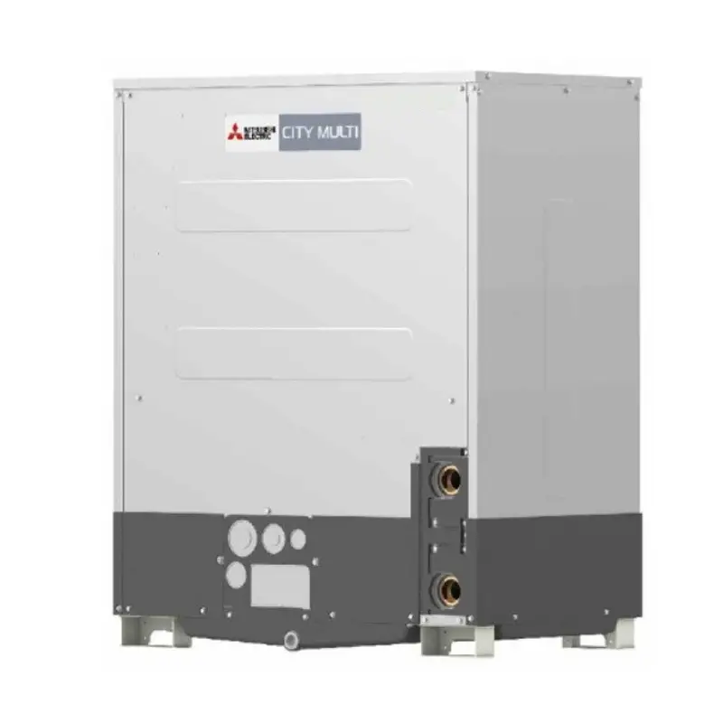 Внешний блок с водяным контуром применяется в многозональной VRF системе City Multi G6 от компании Митсубиси. Компрессорно-конденсаторный агрегат с водяным контуром, который является альтернативой наружным блокам с воздушным теплообменником. Применение водяного контура в внешних блоках объединяет достоинства водяных и фреоновых систем для достижения улучшения показателей энергопотребления и производительности. Устанавливается внутри зданий, обогревает и охлаждает воздуха в промышленных помещениях до 225 м2. Рабочий температурный диапазон наружного воздуха составляет от -5°С до +45°С, как для охлаждения, так и обогрева. Для работы внешнего блока используется безопасный для озонового слоя атмосферы хладагент R-410A, вода или антифриз.