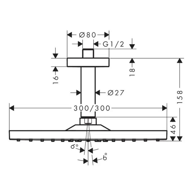 Верхний душ, Hansgrohe, Raindance E, тип установки-потолочный, размер душевого диска, мм-300*300, форма-квадратная, количество режимов-1, тип струи-RainAir, держатель-есть, размер держателя-158, цвет-хром