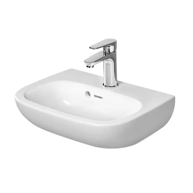 Раковина, Duravit, D-Code, ширина, мм-450, глубина, мм-340, высота, мм-145, тип установки-подвесной/с пьедесталом, отверстия для смесителя-1, с переливом, материал-керамика, цвет-белый