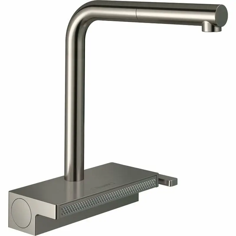 Смеситель для кухни, Hansgrohe, Aquno Select M81, тип открывания воды-рычажный, тип регулирования воды-керамический картридж, монтаж-на раковину/столешницу, отверстия для монтажа-1, высота, мм-281, вынос излива, мм-215, тип излива-L-образный, выдвижной, поворотный, тип подводки-гибкая, стандарт подвода воды-3/8", цвет-сталь, с вытяжным душем