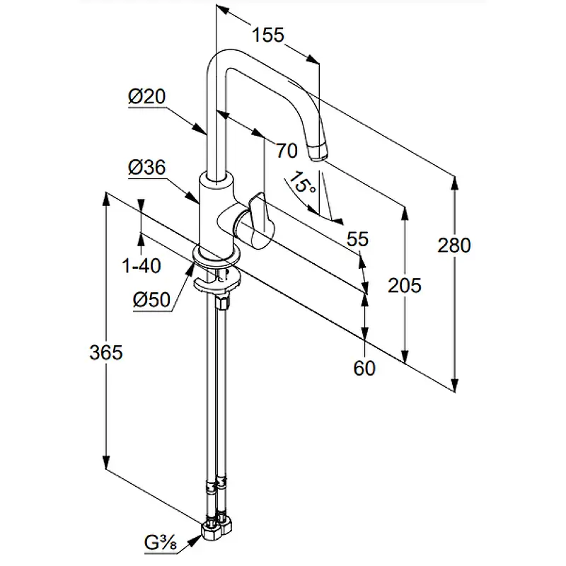 Стандарт подводки: гибкий G 3/8.