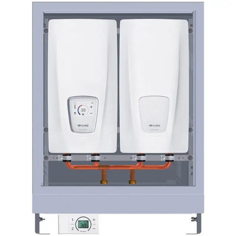Чтобы обеспечить нагрев воды в больших объёмах, применяется комплект проточных водонагревателей CLAGE – это два прибора CLAGE DSX Touch New, которые объединены в единую систему и помещены в шкаф. Раздачу воды на одну или несколько точек разбора при минимальном потреблении 4 л/м можно производить одновременно. Управление настройками производиться с помощью пульта Д/У.
